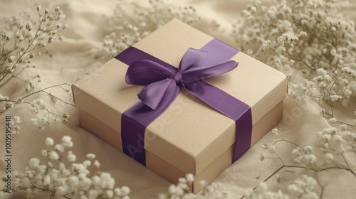 Gift box with purple ribbon surrounded by small white gypsophila flowers generative ai