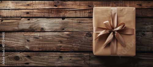 Gift wrapped in simple brown paper with a ribbon and bow set against a backdrop of weathered wooden boards allowing for a copy space image