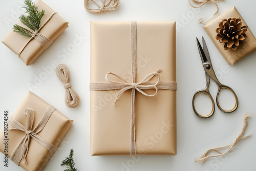 gift, wrapping, paper, scissors, ribbon, holiday, christmas, package, present, brown, minimal, topview, decor, design, workspace, cosy, hand-made, craft, preparation, surprise, natural, style, rustic, neutral, twine, aesthetic, simplicity, new year, modern, creative, christmas season, photo, background