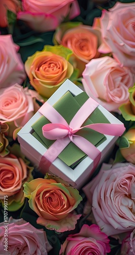 Gift-wrapped box surrounded by roses