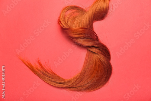 Ginger hair strand on red background, closeup