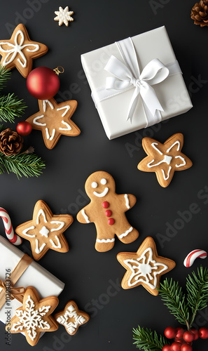 Gingerbread man and gift box on dark background. Homemade sweet cookies created for Christmas and New Year. Holiday background for cards, banners and posters. Flat lay composition, top view with space