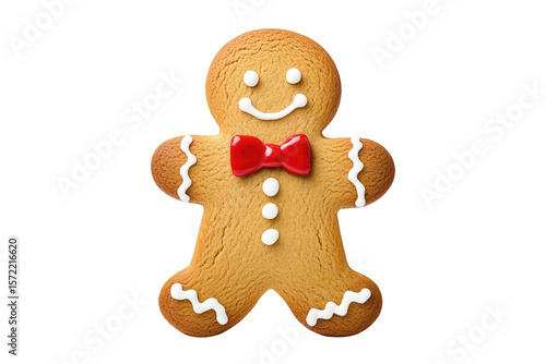 cookie, gingerbread, man, festive, sweet, baked, icing, decorated, red, bow, smile, holiday, christmas, christmas, treat, baked goods, food, delicious, deliciously, classic, traditional, sweetness, comfort food, crispy, gold, brown, pretty, glazed, charming, cute, simple, design, food photography, isolated, closeup