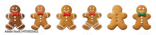 Gingerbread men cookie set including plain, iced, bow tied, and bitten variants isolated. Festive holiday dessert collection.