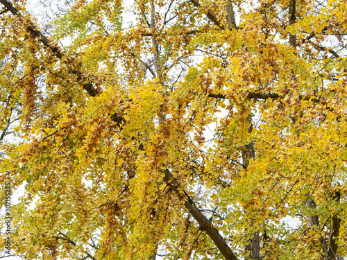 (Ginkgo biloba) Feuilles jaunâtre et ovules jaune-brun du Ginkgo ou arbre aux quarante écus aux couleurs d'automne