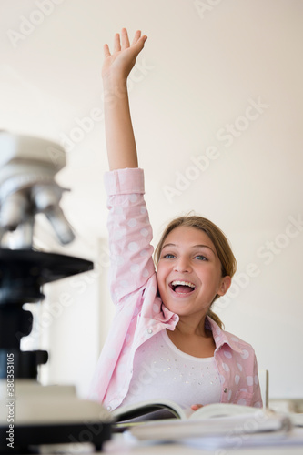 desk, sitting, hand raised, answer, school, vertical, indoor, day, casual clothes, blonde hair, one person, long hair, looking away, mouth open, classroom, selective focus, behind, childhood, education, science, learning, solution, curiosity, cognition, discovery, laboratory, microscope, effort, student, success, enjoyment, adolescence
