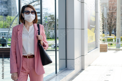 Girl, a young business woman in a protective sterile medical mask on her face in a city. Air pollution, virus, Chinese pandemic coronavirus covid-19 concept.