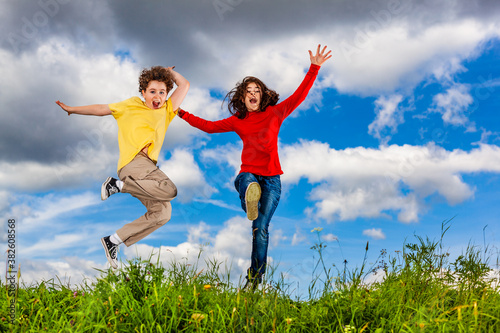 Girl and boy running, jumping against blue sky