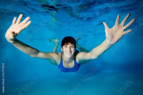 Girl athlete dives to the bottom of the pool and posing for the camera in a blue swimsuit, arms outstretched and smiling. Portrait. Concept. Landscape view
