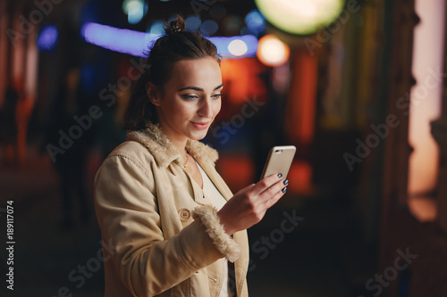 american, caucasian, woman, female, girl, lady, attractive, brunette, beautiful, young, person, pretty, adult, cute, model, cyberspace, technology, connection, phone, screen, communication, touch, phone, mobile, message, smartphone, copy space, electronic mail, device, portability, modern, mobile phone, texting, cellular, fashion, casual attire, style, lifestyle, look, stylish, city, night, street, evening, spring, autumn, fall, jacket