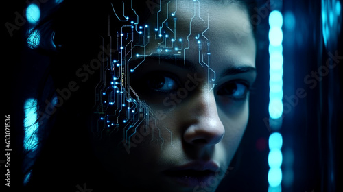 Girl closeup, futuristic concept of modern technology progression. Generated with AI