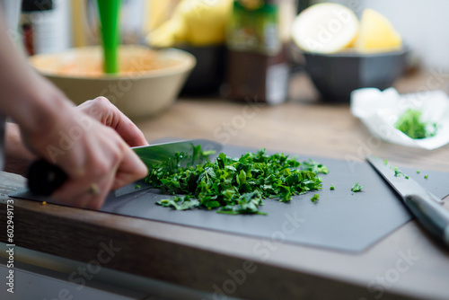Girl cook cuts greens. Green borscht