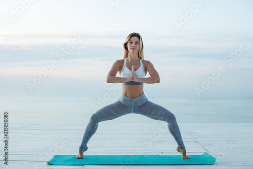 Girl doing yoga in warrior asana in the beach