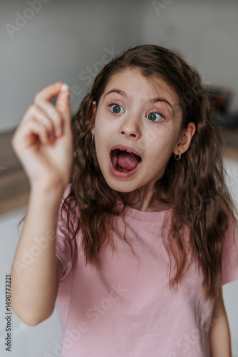 Girl excitedly holding a baby tooth indoors