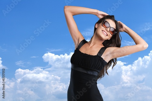 girl, fashion, urban, summer, brown, clothing, gorgeous, street, model, town, goggles, sunglasses, step, spring, car, pose, adult, outside, 1, caucasian, female, walk, smiling, posing, portrait, cute, purse, dress, healthy