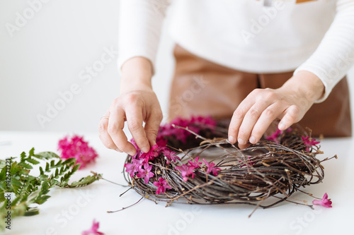bouquet, florist, beautiful, spring, arrangement, flower, vase, young, bloom, blossom, bunch, business, caucasian, concept, consumerism, fern, flora, floral, green, greenery, happiness, natural, packing, pecking, arranging, assembling