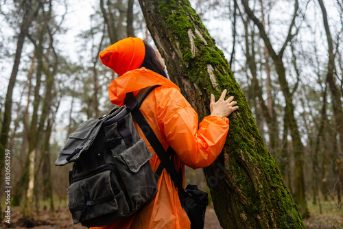 Girl hand touches a tree with moss in the wild forest. Forest ecology. Wild nature, wild life. Earth Day. Traveler girl in a beautiful green forest. Conservation, ecology, environment concept.