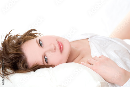 woman, beauty, bed, awake, attractive, beautiful, blouse, bright, brown, caucasian, cheerful, chemise, clothing, collar, comfortable, cotton, day, face, female, hair, high, indoor, key, lie, life, light, morning, natural, only, portrait, pretty, relaxation, sensuality, sexy, sheet, shirt, sitting, skin, smiling, waking, white, woman, young