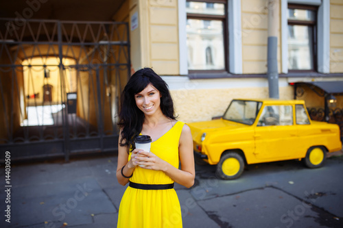 Girl in a light yellow dress with a Cup of coffee on a background of yellow cars