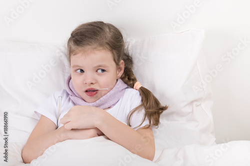 girl in bed, took a spoonful of medicine and looks at the right