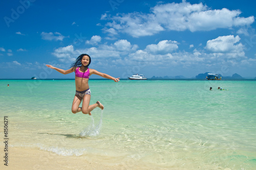Girl jumping in the water at the beach of the Koh Ngai island Th