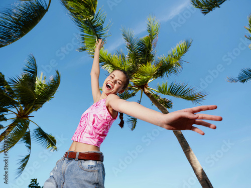 Girl jumping with outstretched arms and smiling in front of a palm tree, capturing joy and movement against a tropical backdrop