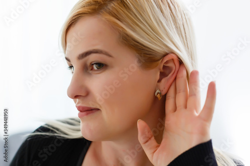 background, music, woman, business, hand, person, girl, face, adult, her, isolated, listen, news, people, palm, part, perception, secret, sound, young, hear, little, gossip, attentive, attitude, beautiful, head, caucasian, chat, chatting, closeup, conversation, body, ear, expression, female, hot, cute, blab, white, intimate, businesswoman, portrait, model, close, lady, indoor, human