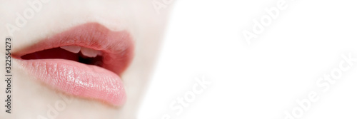 Girl natural lips close up on white panoramic background