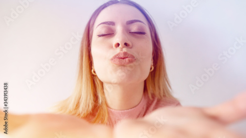 attractive, background, beautiful, beauty, blond, charming, cheerful, cute, dream, european, expression, face, fashion, female, girl, girlfriend, glamour, hair, coiffure, happy, isolated, kiss, lip, love, model, 1, person, pink, portrait, positive, pretty, sexy, smile, studio, style, stylish, white, woman, young