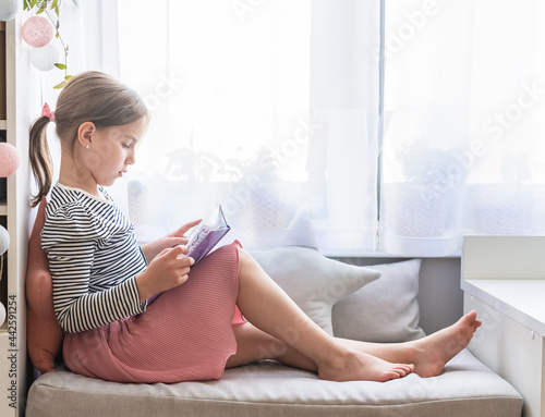 girl sits on the couch and reads a book