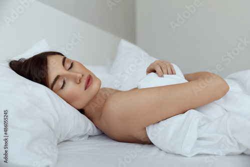 home, apartment, flat, interior, inside, indoor, domestic, lifestyle, woman, girl, young, caucasian, beautiful, attractive, european, pretty, day, daytime, female, person, cute, roomy, bed, morning, bedchamber, rest, blanket, resting, pillow, relax, relaxing, naked, closed eyes, lay, laying, comfort, naked, comfortable, sleep, sleeping, white, dream, slim, weekend