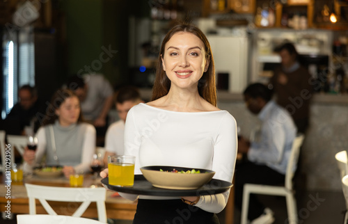 Girl waiter with tray walks between rows of tables. Employee of public catering cafe carries order to client, ready to serve guest of cafe establishment.