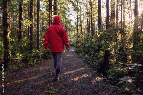 Girl wearing a bright red jacket is walking the the beautiful woods during a vibrant winter morning. Taken in Ucluelet, Vancouver Island, BC, Canada.
