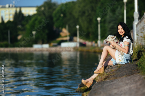 beautiful, young, city, sitting, shore, lake, water, girl, dog, 1, puppy, teenage, hold, little, park, pet, spring, domestic, summer, female, friends, friendship, embracing, rest, cheerful, front, outdoors, smiling, staring, animal, casual attire, happy, joy, relax, smile, together