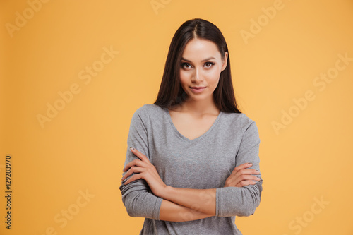 woman, orange, background, standing, young, casual attire, girl, sweater, posing, front, adult, clothing, content, people, female, confidence, elegant, confident, pretty, isolated, gorgeous, hand, attractive, shot, studio, cute, high, person, beauty, joyful, beautiful, looking, photogenic, arm, crossed, camera, thoughtful, concentrated