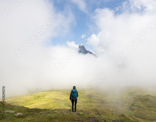 Girl with backpack hiking, Midi d?Ossau peak in the background in the Pyrenees National Park, France.