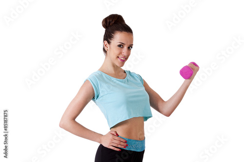 health, healthy, happy, happiness, gym, lifestyle, weight, training, sporty, portrait, sport, fitness, pink, dumbbell, energy, exercise, enjoying, hand, body, activity, active, cheerful, muscular, leisure, strength, motivation, muscle, lifting, athlete, physical exercise, vitality, bicep, girl, female, woman, young, beauty, pretty, teenage, sexy, model, slim, latina, bun