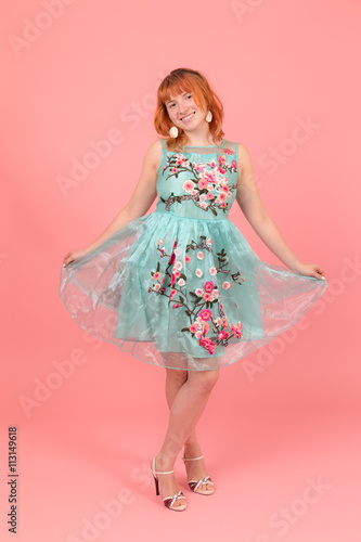 girl, background, red, adult, dress, colours, female, model, fashion, pink, woman, young, beauty, 1, studio, caucasian, person, hair, clothing, carefree, glamour, elegance, portrait, standing, femininity, smiling, cheerful, leg, face