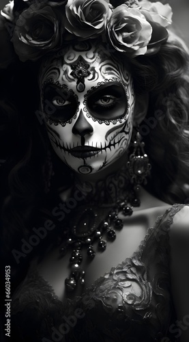 girl with skull makeup for the Day of the Dead in Mexico and Latin America. Black and white photography, portrait, Halloween