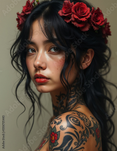 glamour, tattoo, black, woman, girl, flower, beautiful, portrait, face, art, hair, pretty, adult, model, fashion, attractive, body, beauty, female, closeup, skin, young, make-up, lady, pleasure, graceful