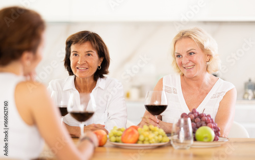 Girlfriends chatting and drinking wine at home party table in kitchen