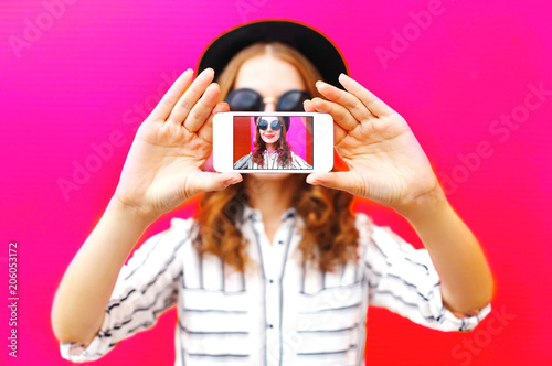 Girll taking picture self portrait on smartphone over colorful pink background
