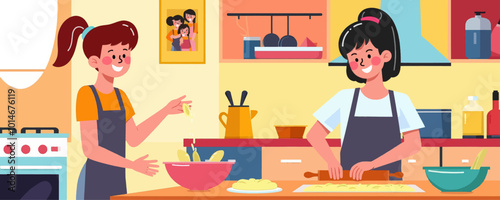 kitchen, two people, woman, cooking, baking, indoor, happy, smiling, apron, food, family, home, day, illustration, adult, girl, counter, table, friends, friendship, activity, lifestyle, preparing