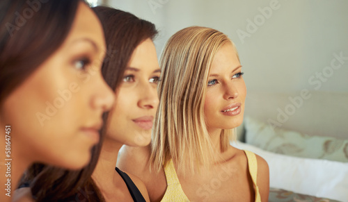 Girls day. three attractive young women sitting together indoors.