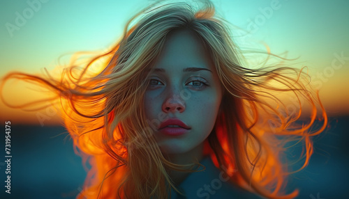 girls hair moving in the wind by night, hair in front of face, blurred background,generative ai