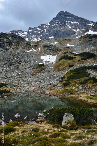 peak, rock, snow, lake, duck pond, water, glade, forest, glacial, slope, spruce, tour tourism, leisure, trip, path, hiking trail, tree, shrub, sky, cloud, plant, landscape, back, mountain, poland, europa
