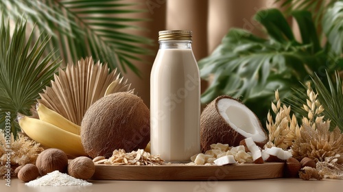 Glass bottle of almond milk surrounded by bananas and coconuts on a table filled with tropical ingredients and greenery