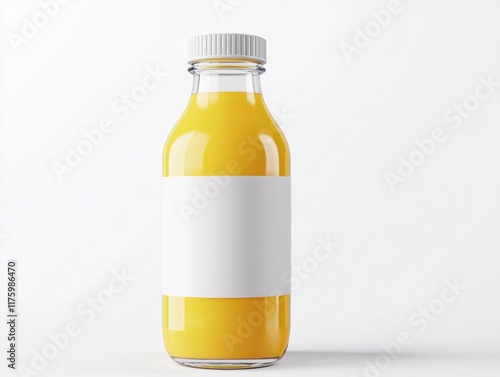 Glass bottle of orange juice with blank label on white background.