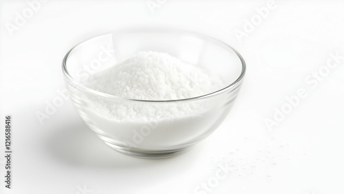 Glass bowl of coarse salt on white background symbolizes cooking, simplicity, and health.