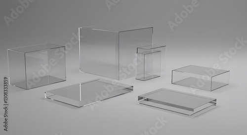 Glass boxes for exhibition. Transparent podium, pedestals, bases for goods. Empty glass space templates. 3d render illustration.